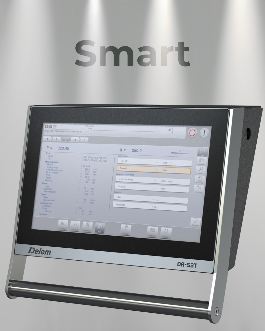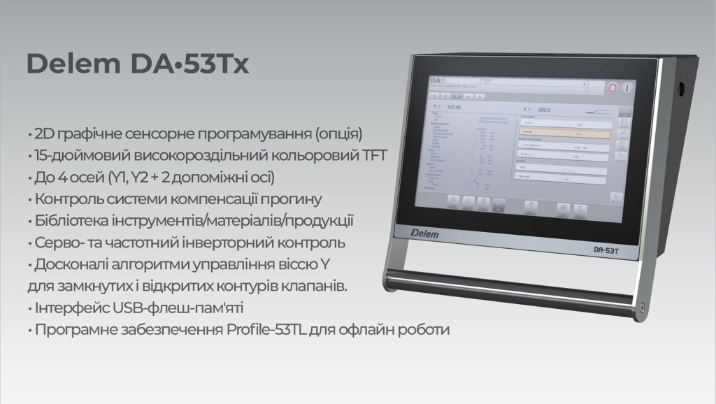 ЧПУ DELEM DA53Tx з 2D кольоровою графікою: Система чисельного програмного керування з двовимірним кольоровим дисплеєм для зручного програмування та візуалізації процесу гнуття.